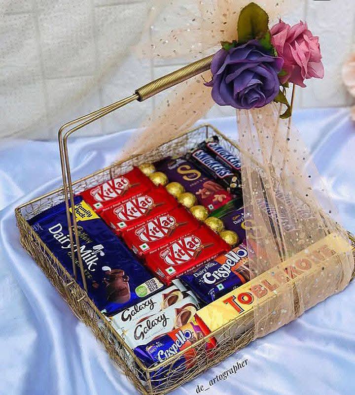 The Elegant Chocolate Basket Gift is a beautifully arranged collection of assorted chocolates presented in a stylish metal basket with a decorative floral handle.