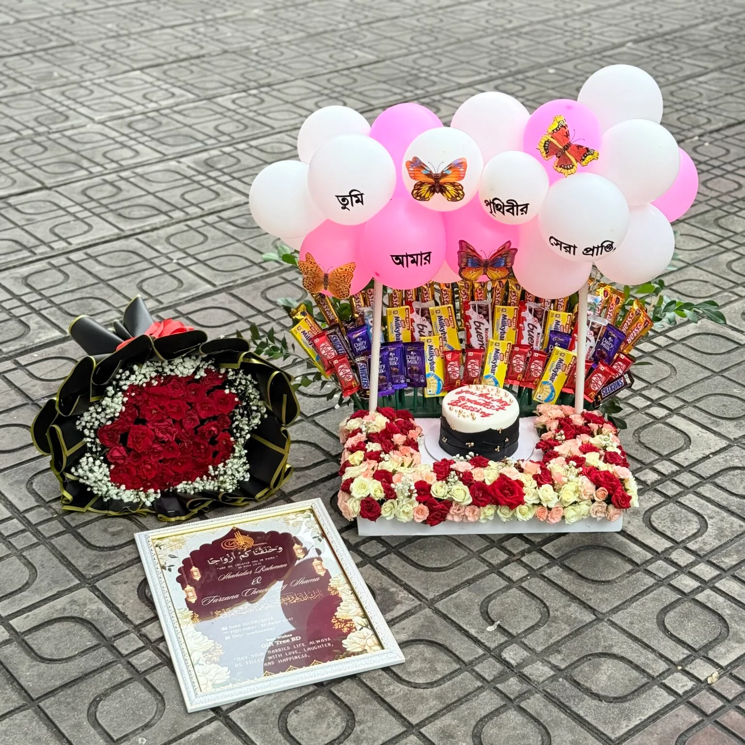 This premium set includes a stunning chocolate featuring KitKat, Dairy Milk, Perk, 5 Star, and more. It also comes with a custom-designed cake, a romantic red rose bouquet, printed balloons with special messages, and a beautifully crafted memory frame. The entire arrangement is presented on a tray decorated with fresh roses to create a breathtaking surprise.