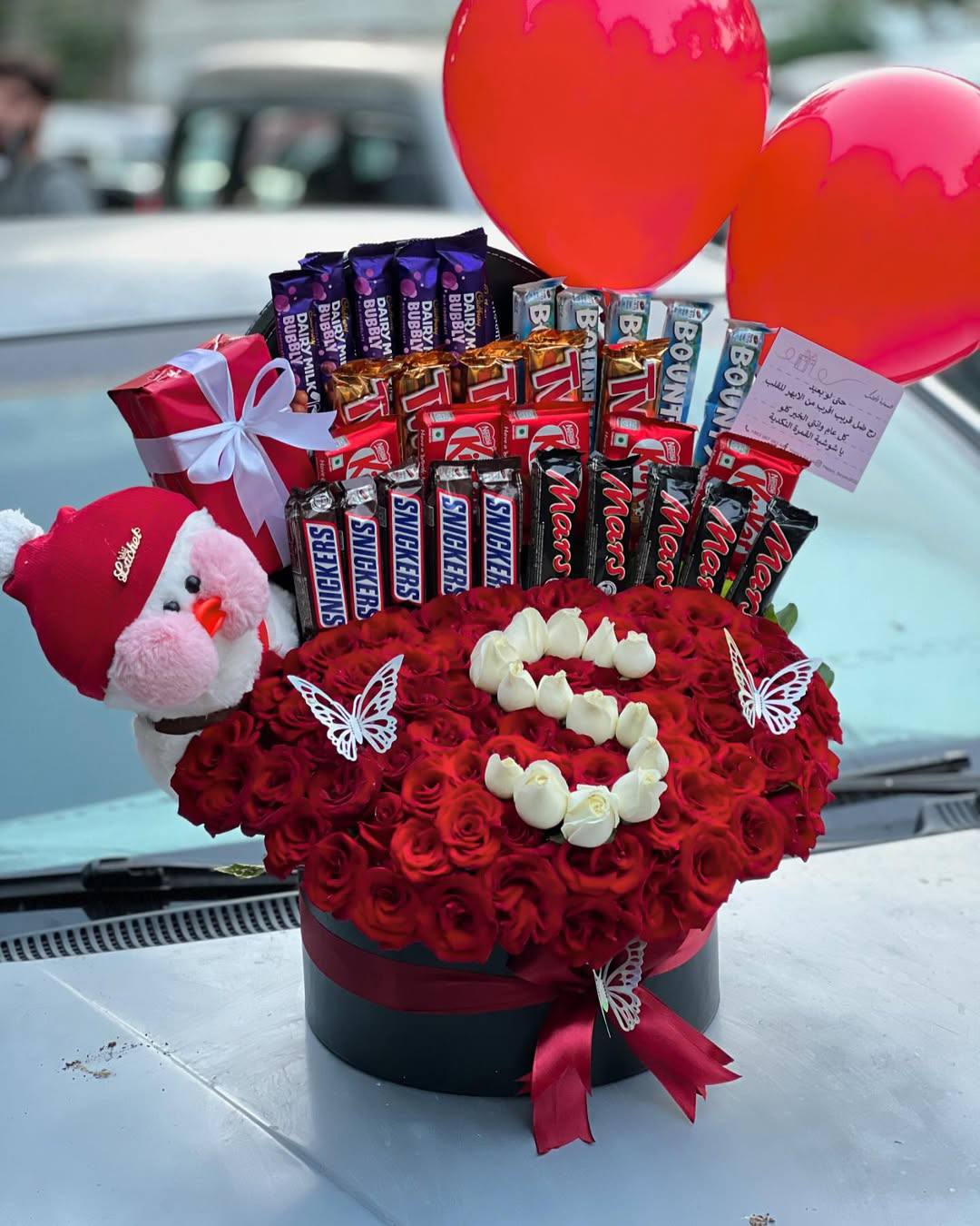 A romantic luxury gift box filled with red roses, a heart of white roses, premium chocolates, balloons, and a cute teddy bear. Perfect for expressing love on Valentine’s Day, anniversaries, or special moments.