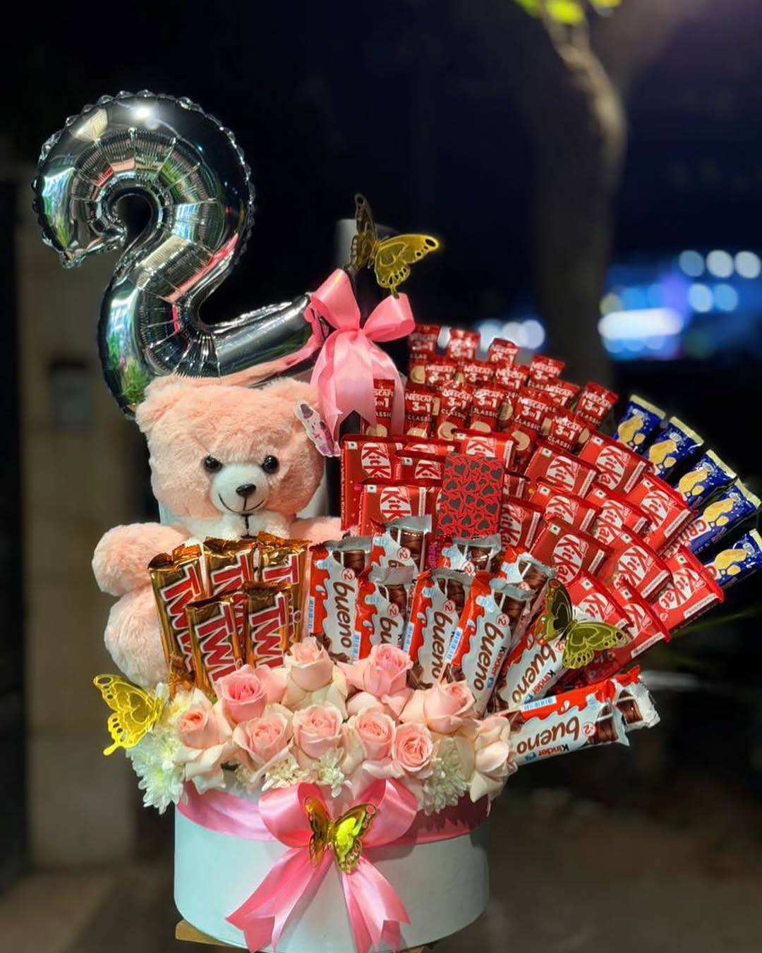 A charming celebration box featuring soft pink roses, a cute teddy bear, a silver number 2 balloon, and a generous mix of chocolates. A sweet and playful gift, perfect for anniversaries, milestones, or celebrating two years of love.